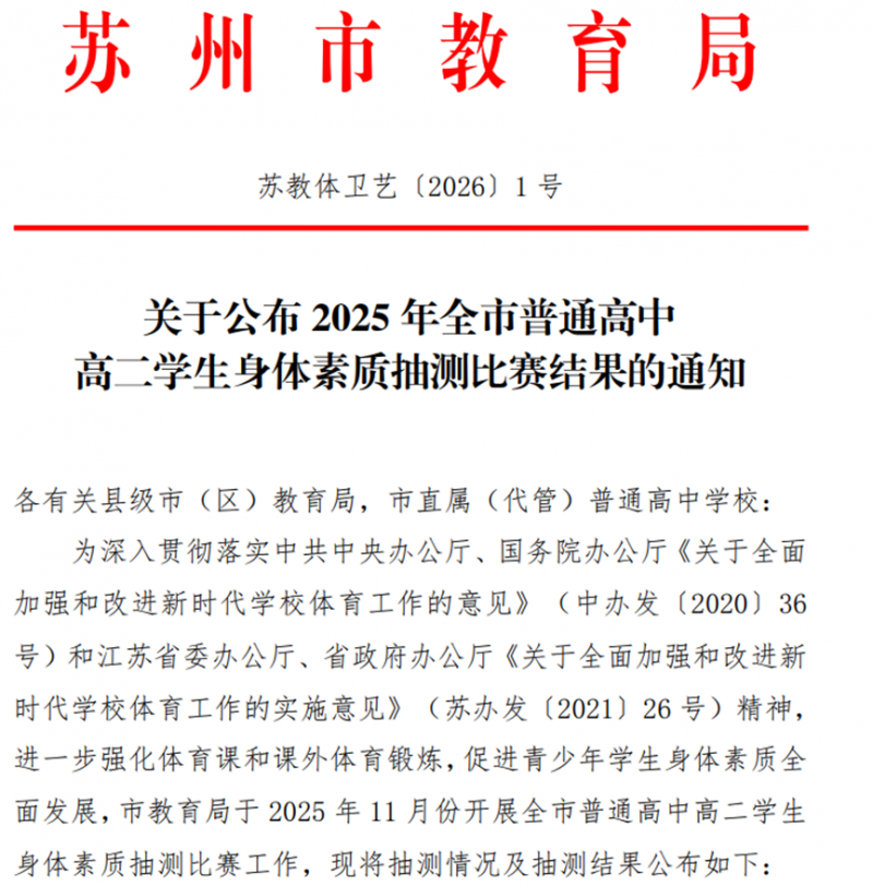 近日,2025年全市普通高中高二学生身体素质抽测比赛结果正式揭晓,吴江高级中学高二学子获全区第一名的好成