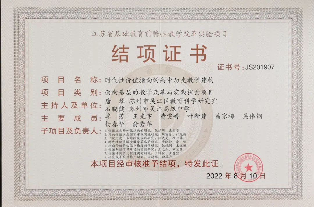 我校作为项目的基地学校,长期以来,在唐琴老师的引领和指导下,始终聚焦“立德树人”,探索学科育人方式转型,实现了真实问题到理论模型的进越,从教学思想到学科实践的跨越,从路径创新到成果凝练的超越,形成了“立德树人”历史学科落地的学科范式。我校有多位老师作为核心成员全程参与了项目研究,石晓健、叶新建、顾俊、杨春华、王光宇、俞秀萍、张建明、吴林珠、陈春娟、张建秋等老师借助研究,5次获得省、市教育教学成果奖,2次获得省教育科研成果奖,2人被评为苏州市学科带头人,6人被评为吴江区学科带头人,多人获得省、市教学基本功、优质课一等奖。