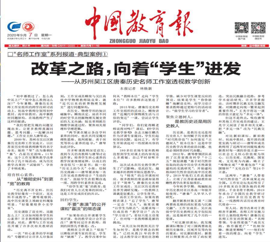 唐秦团队的研究成果在教育部“新课程新教材示范区示范校全员研修课程研发”和人教社“普通高中深度学习教改推进项目”推广;得到了首师大、华师大、陕师大、南师大、扬大等多所高校专家高度认同和学界鼎力支持,多次被《人民教育》《中国教育报》“学习强国”报道。