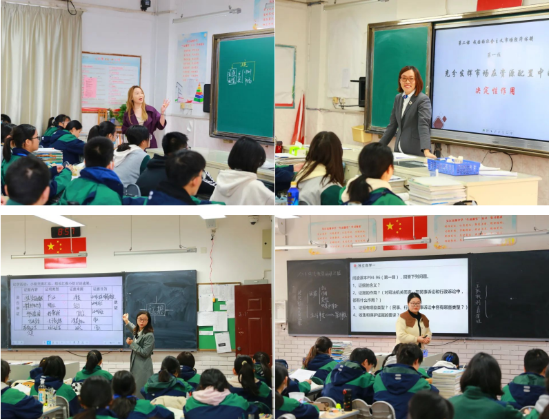 在课堂展示环节,吴江高级中学钮娟华老师和北外苏州湾学校刘鑫鑫老师围绕《充分发挥市场在资源配置中的决定性作用》一课开展同课异构,吴江高级中学费金娟老师和枫华学校栗厚蓉老师围绕《依法收集运用证据》一课开展同课异构。四位老师都以议题为引领、以情境为载体、以任务为导向,突出价值立意、素养立意、能力立意,注重师生、生生互动,以活泼的方式引导学生落实教学目标,学生在轻松愉快的氛围中收获满满。