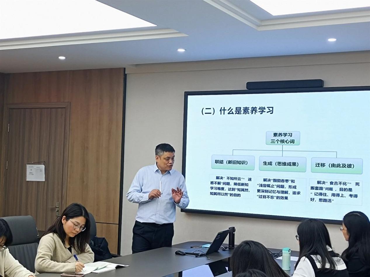 在交流研讨环节,江苏省特级教师、正高级教师、吴江中学原党委书记沈雪春老师以议题式教学的视角对各位老师的课展开评课,他以具体的课例为例针对议题式教学展开中的情境、任务、活动、知识等重要要素对一线老师的课提供了方向性点评和指导。