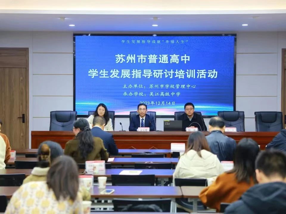 2023年12月14日上午,“苏州市普通高中学生发展指导研讨培训”活动在吴江高级中学举行。苏州市教育局校管中心徐勇主任、张淑燕老师,立项学校代表等参加会议。