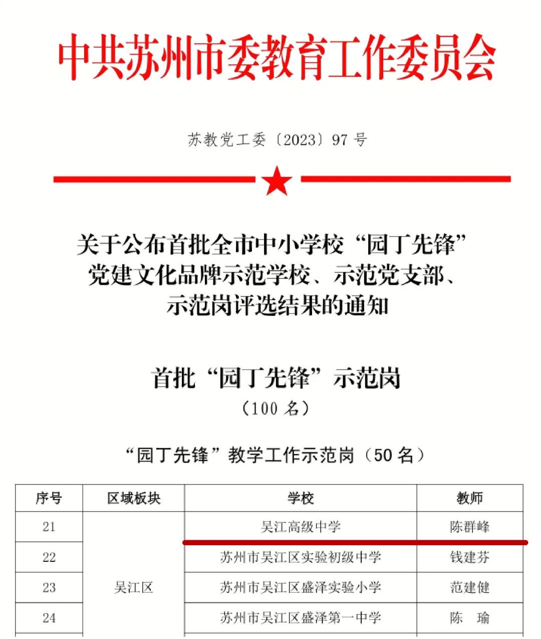 苏州市委教育工委公布了一批先进典型,我校陈群峰老师被表彰为苏州市首批“园丁先锋”示范岗!