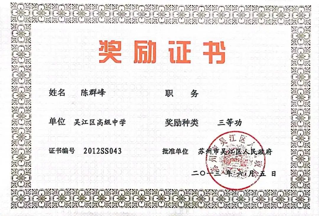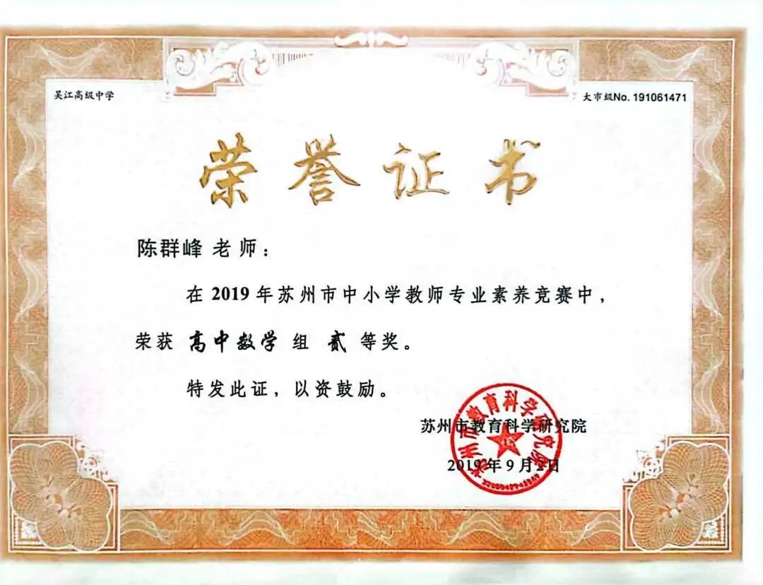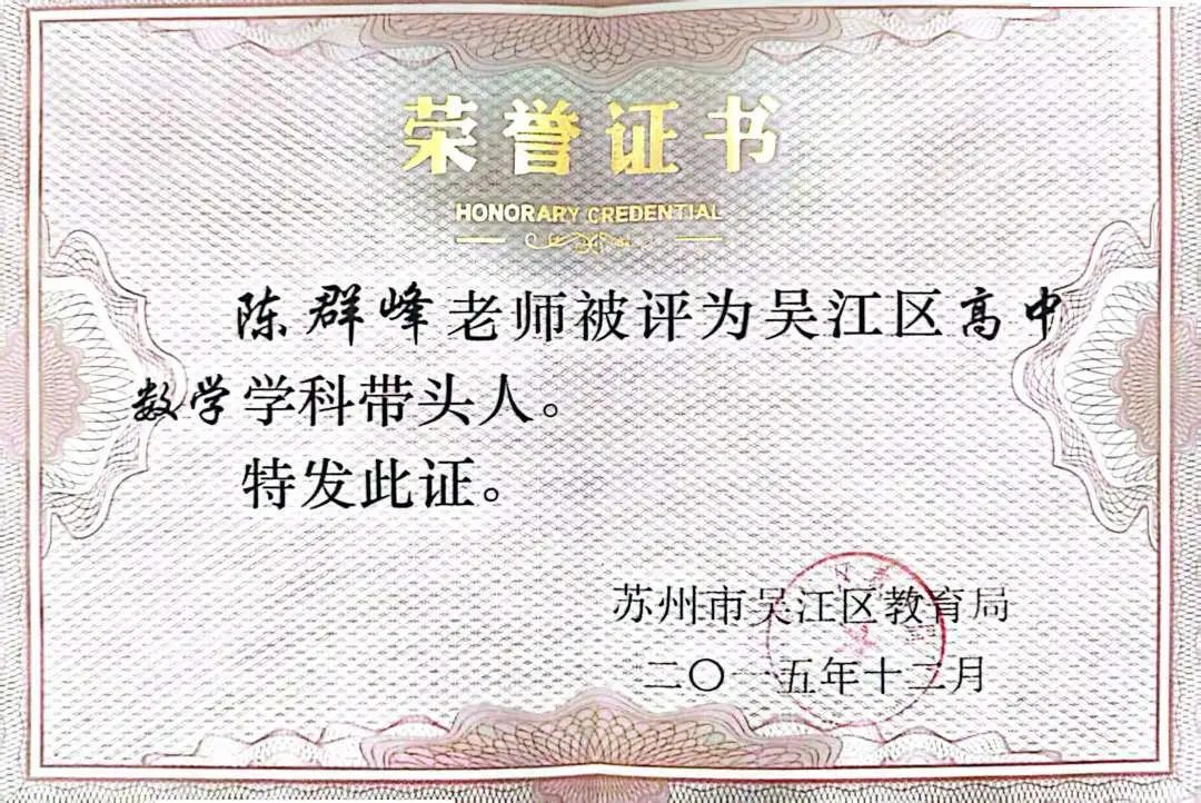 陈群峰, 2004年8月参加工作,2002年加入中国共产党,2004年6月毕业于南京市师范大学数学与计算机科学学院数学与应用数学(师范)专业。现任吴江高级中学高三数学备课组长。2015年被评为吴江区学科带头人,2018年被评为中小学高级教师。