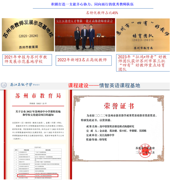 2024年2月27日,在全区教育系统新学期工作暨全面从严治党工作会议中,我校被授予“吴江区国家课程高质量实施工程实验学校联盟学校”的称号。近三年,学校各项工作稳中有进,学生的发展力增强,家长认可度、社会影响力逐步提升,党委书记金永建作为县域普通高中代表介绍相关做法。