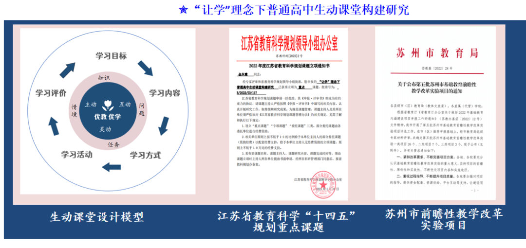 2022年以“'让学'理念下普通高中生动课堂构建研究”为题,我校成功立项了江苏省教育科学“十四五”规划重点课题、苏州市前瞻性教学改革实验项目。“让学”理念下生动课堂教学评价量表制定、“12345”课堂模型设计、生动课堂课例研究、全学科建设、平台搭建,课题、项目引领教学改革落到实处、走向深处,在不断提升规范办学程度的基础上,稳步提升课堂效率与达成度。