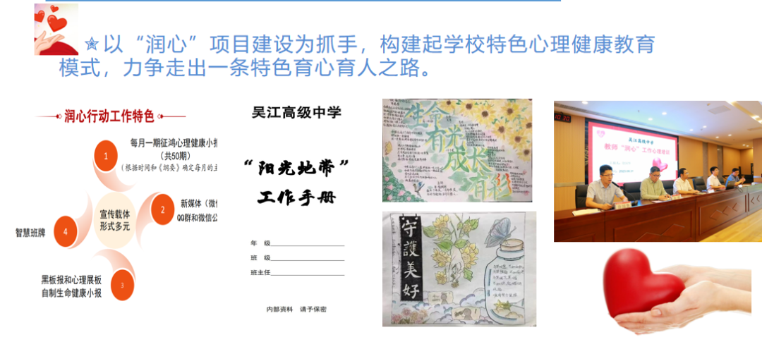 目前学校以“润心”项目建设为抓手,构建起学校特色心理健康教育模式,力争走出一条特色育心育人之路。强化“四会”心育队伍建设,推进心育导师、全员导师、朋辈互助建设;推进“润心”平台搭建,丰富宣传载体和心育活动、增设网络信箱和心理热线、优化“阳光地带”心理辅导室功能;构建“家校社”协同润心机制,推动家长教育工程、充分利用社会资源、畅通“家校”沟通渠道。