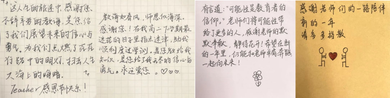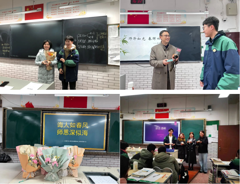班会课上一束束鲜花、一段段文字表达的是同学们对老师的心意与感恩。