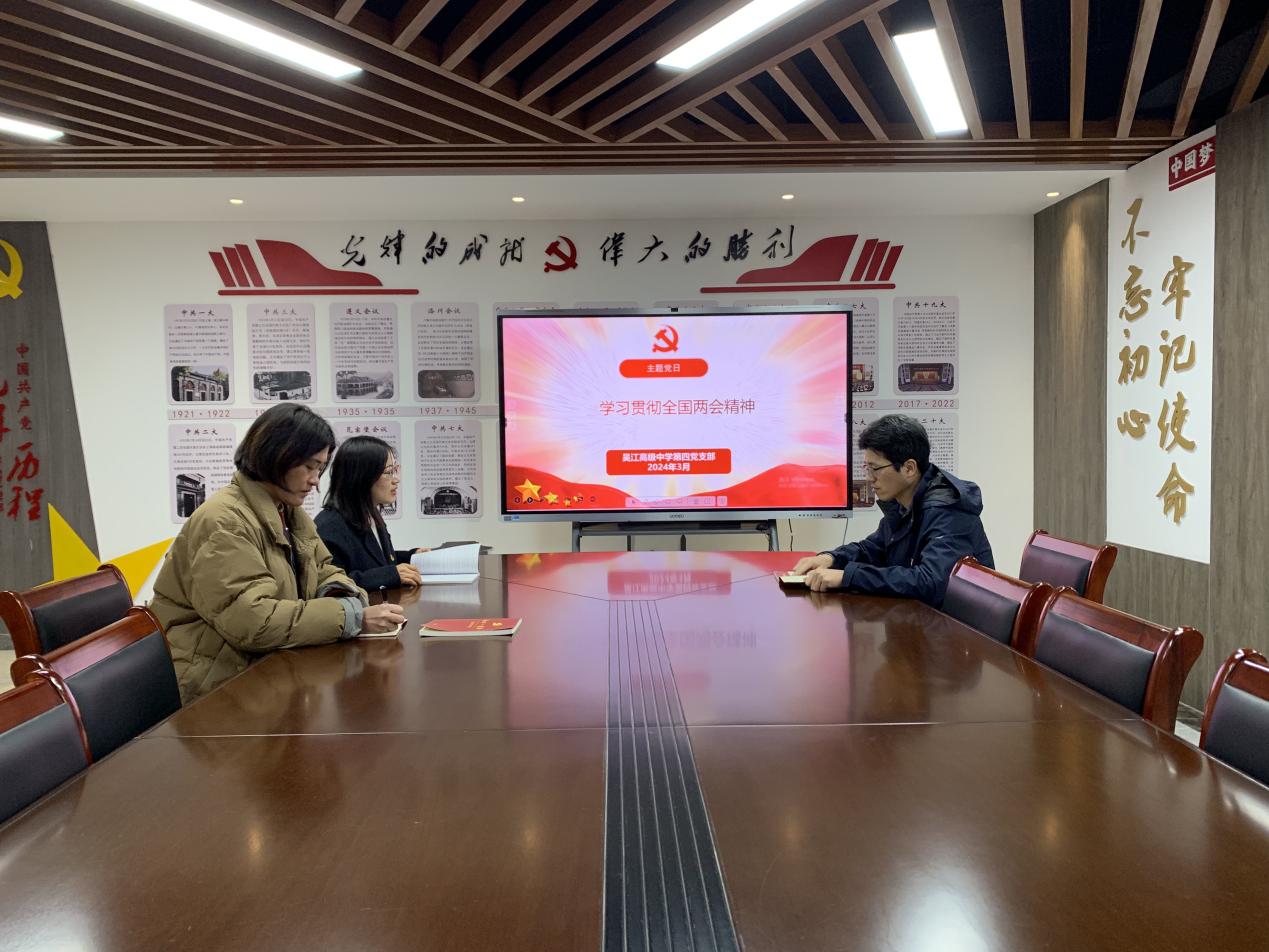 2024年3月18日,吴江高级中学第四党支部全体党员集中在行政楼底楼党员活动室围绕学习贯彻全国两会精神开展主题党日活动。