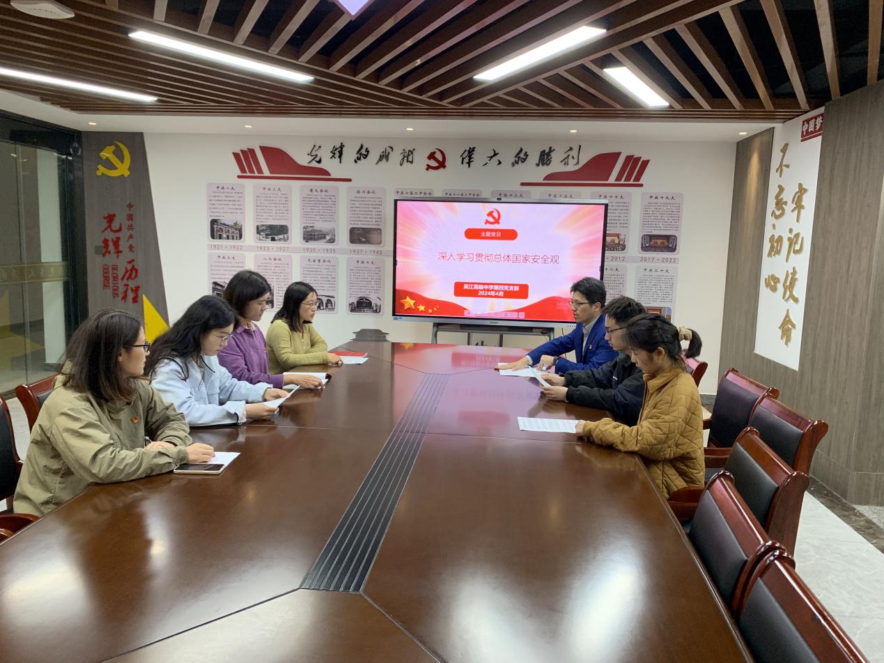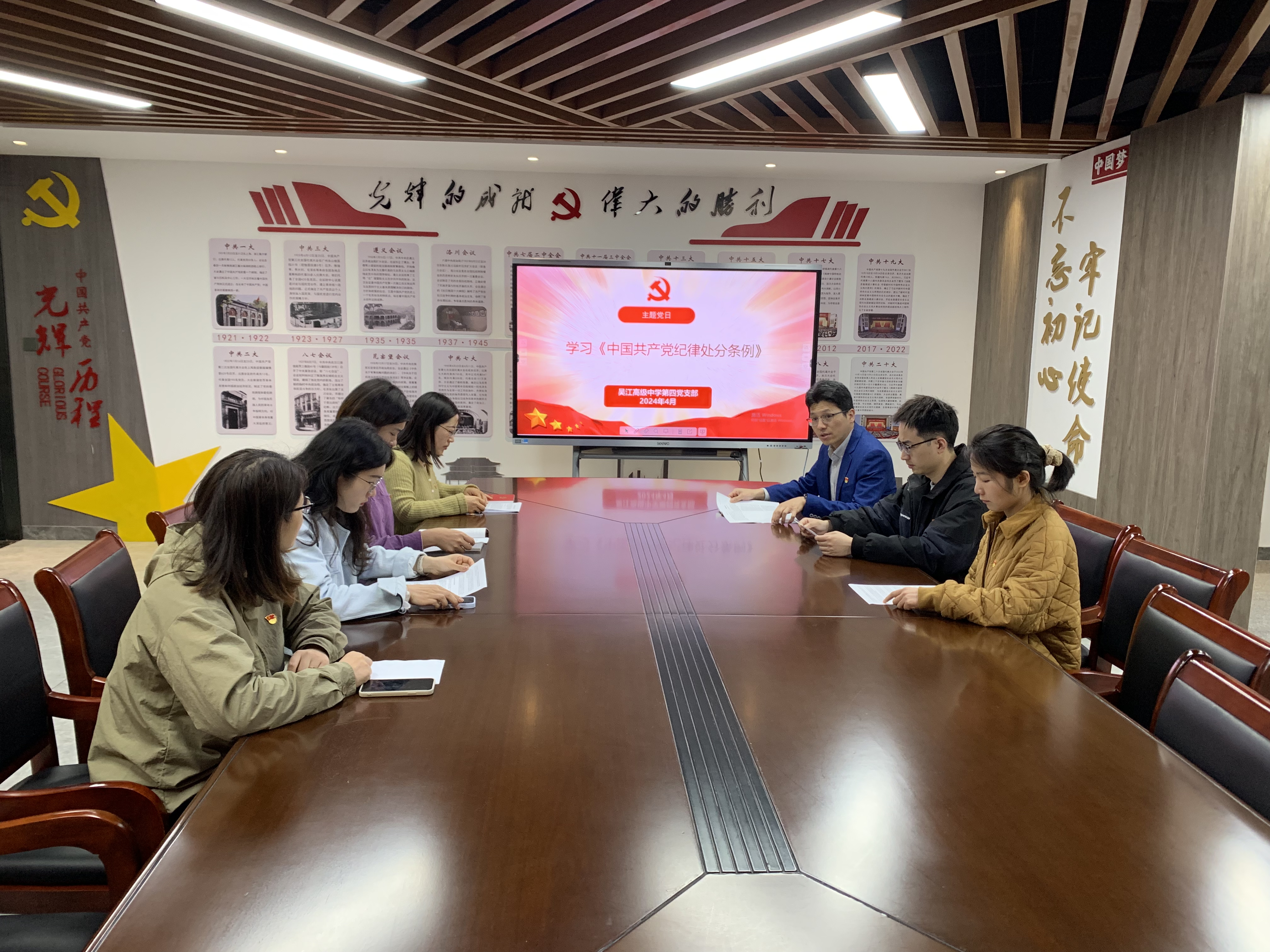 2024年4月18日,吴江高级中学第四党支部全体党员集中在底楼党员活动室围绕学习《中国共产党纪律处分条例》和深入学习贯彻总体国家安全观开展主题党日活动。