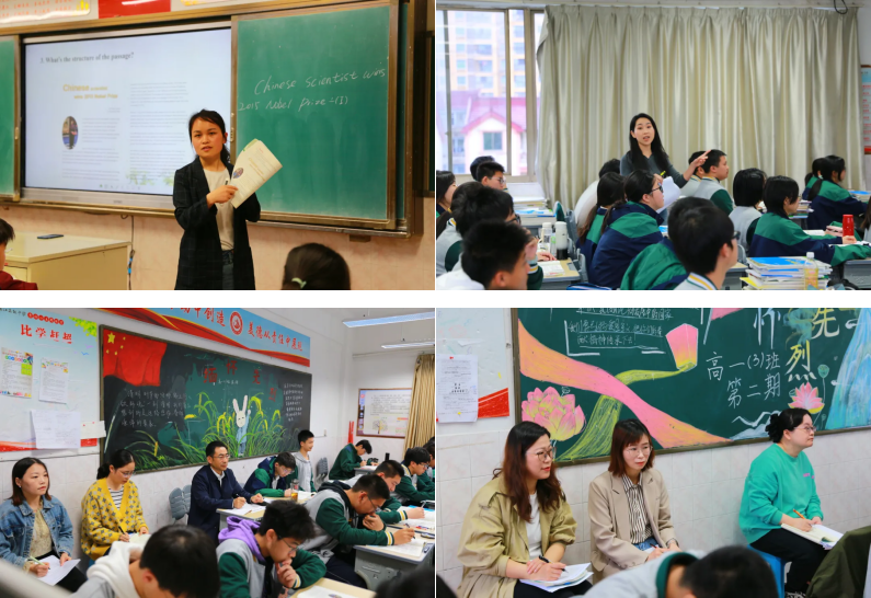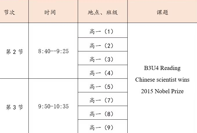 此次考核采用抽签形式,将八位新教师分成两组,每四位教师同时在不同班级开课,专家评委分成四组,点对点全程追踪,进行课堂纪实,从文本设计、环节设置、课堂表现、语言基本功、学生反馈等多个维度进行打分。此次课堂考核的内容为必修三第四单元Reading课文,文章体裁为新闻报道,课题为Chinese scientist wins 2015 Nobel Prize。八节课堂展示,各有特色,精彩纷呈,充分展示了新教师扎实的基本功与课堂的掌控力。