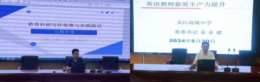 吴江区高中英语名师工作室领衔人金永建书记围绕《英语教师教育新质生产力提升》进行专题讲座。金书记从教育理念、教学方法、科技创新等角度出发,鼓励英语教师进行深度教学研究和创新实践。吴江高级中学王文权老师围绕《教育科研写作思维与实践路径》和老师们一起分享了教育论文写作的心得,从选题、准备、构文、修改四个角度介绍了论文写作过程的一些技巧和注意事项,为青年教师的论文写作指点迷津。