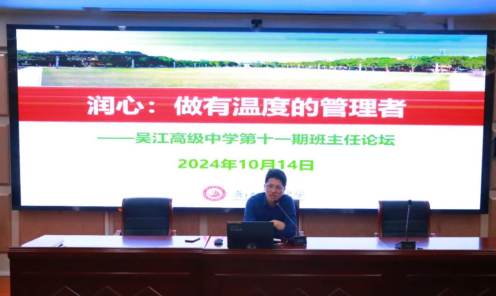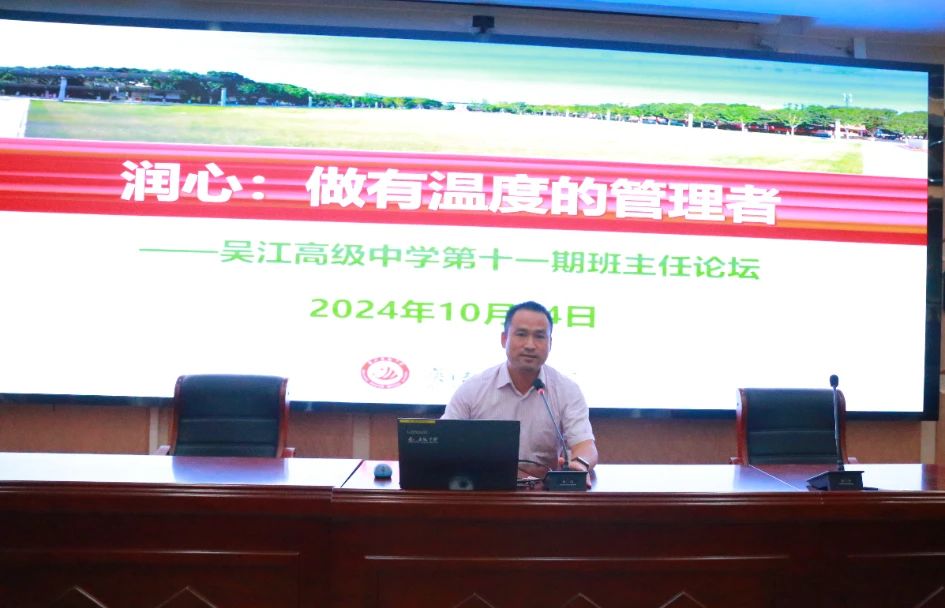 秋天的阳光温暖而耀眼,如同班主任老师一样,炽热而富有博爱。为强力推进学校班主任队伍的建设,提高班主任的育人能力,学习共享班级管理的好方法、好经验。2024年10月14日,吴江高级中学在高三阶梯教室召开了以“润心:做有温度的管理者”为主题的第十一届班主任论坛。本次会议由德育处主任曹惠平主持,与会的有徐国华副校长,德育处成员以及全校班主任。
