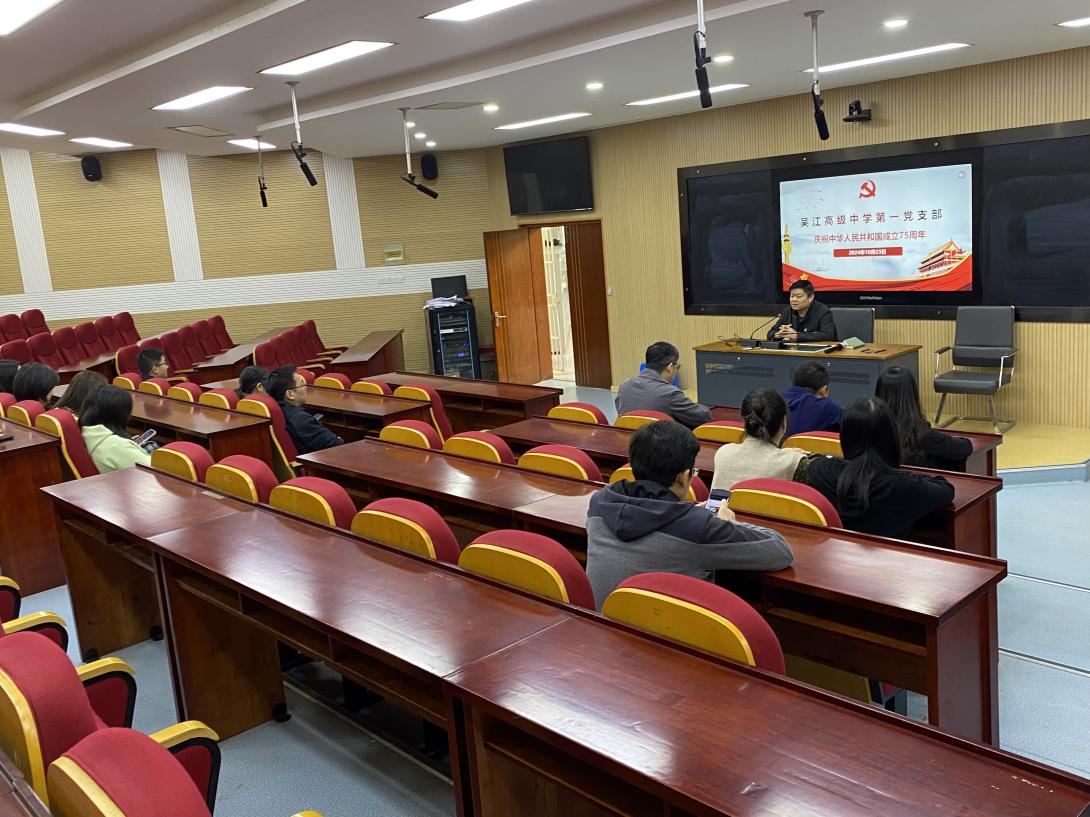 2024年10月23日,吴江高级中学第一党支部全体党员集中在高一阶梯教室,围绕庆祝中华人民共和国成立75周年,开展主题党日活动。