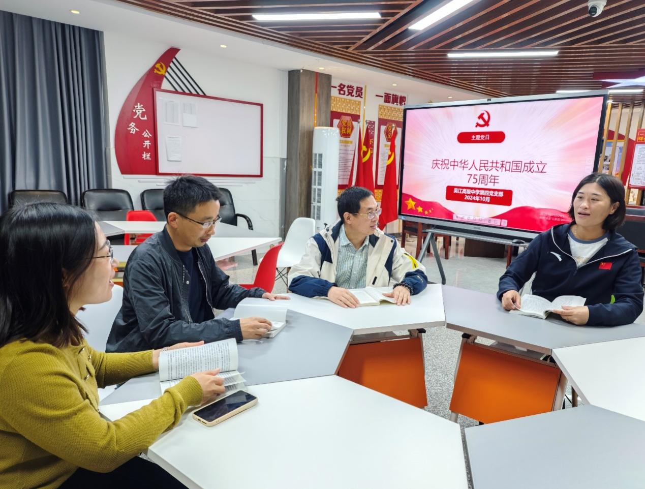 2024年10月23日,吴江高级中学第四党支部全体党员集中在行政楼一楼党员会议室围绕庆祝中华人民共和国成立 75 周年,开展主题党日。