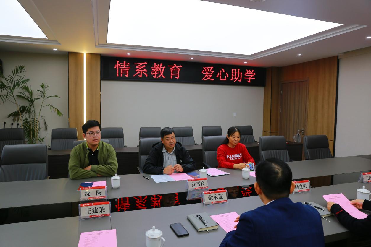 党委书记金永建代表学校党委、全体师生对沈雪良先生表示热烈的欢迎和衷心的感谢,感谢沈雪良先生对学校的关注和支持。此次捐资助学活动充分体现了企业家大爱无疆、情系教育的博大情怀,彰显了企业家的无私大爱与责任担当。党委书记金永建还介绍了我校近几年的高考情况、发展情况、校园文化及教学成果等,并对此次善款的用途和管理进行说明。