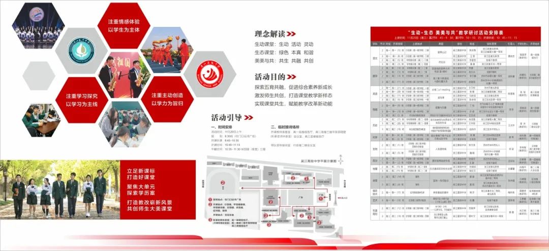 活动得到了吴江区教育局教研室的大力支持,两校骨干老师以“同题异构”方式展示“教学评一致性”学历案课堂,建构“让学”理念下生动课堂,集中展示了语文、数学、英语、物理、化学、生物、政治、历史、地理等九大学科,同时还展示了学生生涯规划指导、艺术教育、技术教育、体育教育等特色板块课程。