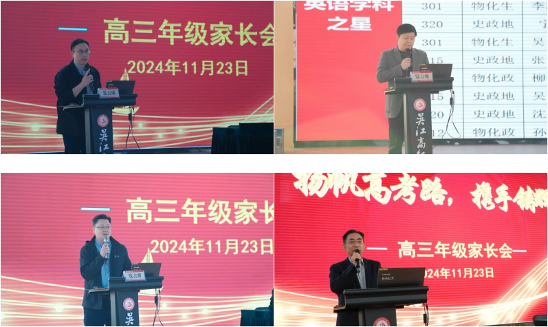 征鸿楼四楼全体家长会由高三年级部部长袁靖主持,党委书记金永建,王孙斌副校长以及高三年级部副部长李文静,共同出席。会议伊始,李文静就高三期中考试成绩做简要分析,王孙斌副校长肯定了本届高三学子学习氛围,同时对学生提出殷切期望。党委书记金永建表达了对高三学子的殷切盼望和坚定信心,希望家长与学校携手并肩,为孩子的高考梦想保驾护航!