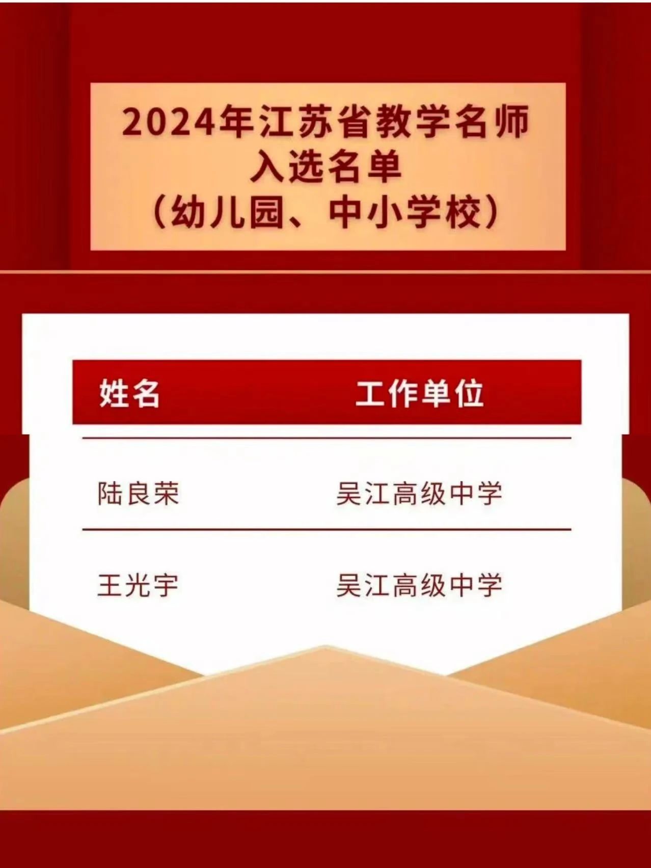 根据省教育人才队伍建设年度计划,经各高校、设区市教育局推荐,省教育厅组织专家遴选出2024年江苏省教学名师300人,吴江区4位教师入选,吴江高级中学2位教师榜上有名。