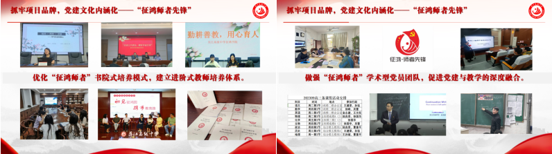 深入开展“书记项目”,推进“一校一品”——“征鸿师者先锋”党建文化特色品牌创建,推进“301515生动课堂”变革项目,强化高三行动支部建设。党建融入进学校发展。