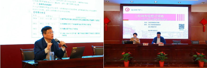 为深入探讨高考命题改革方向,优化高三地理二轮复习教学策略,2025年3月25日,由苏州市教育科学院承办,吴江区教育局教研室、吴江高级中学承办的2025届高三地理备课组长会议在吴江高级中学顺利举行。在活动中,来自各区的优秀教师展示了基于问题情境探究的微专题复习课,学科专家深度剖析了江苏高考命题对教学的启示,参会教师围绕课例共同研讨核心素养引领下的高三二轮复习策略。教育科学研究院地理教研员嵇瑾老师主持活动并进行了工作部署。