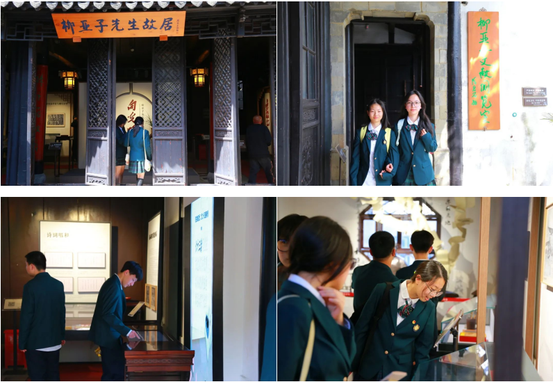 五进建筑错落有致,精美的砖雕门楼雕刻着细腻的图案,古朴的厅堂楼屋弥漫着岁月的韵味。每一处细节都在无声地讲述着过往的故事,在讲解员的细致引导下同学们了解到柳亚子先生年少时便胸怀壮志,毅然投身革命事业。他借助文学创作的力量传播革命思想,努力唤醒民众的爱国热情。大厅内柳亚子先生的半身塑像庄重肃穆,仿佛正深情地向同学们讲述他为民主革命不懈奋斗的传奇经历。