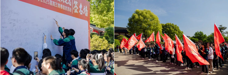 高三学子们签名墙上庄重写下诺言,昂扬挥舞班级旗帜。