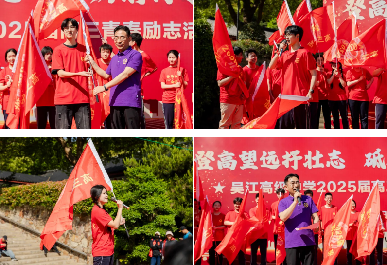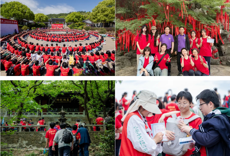 吴高行政团队、各班班主任陪伴同学带着研学任务攀爬穹窿山,沿路集齐“金、榜、题、名”四个章,祈福坛领取定胜糕。