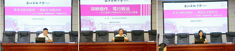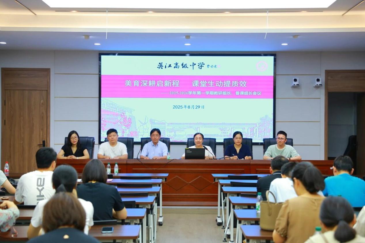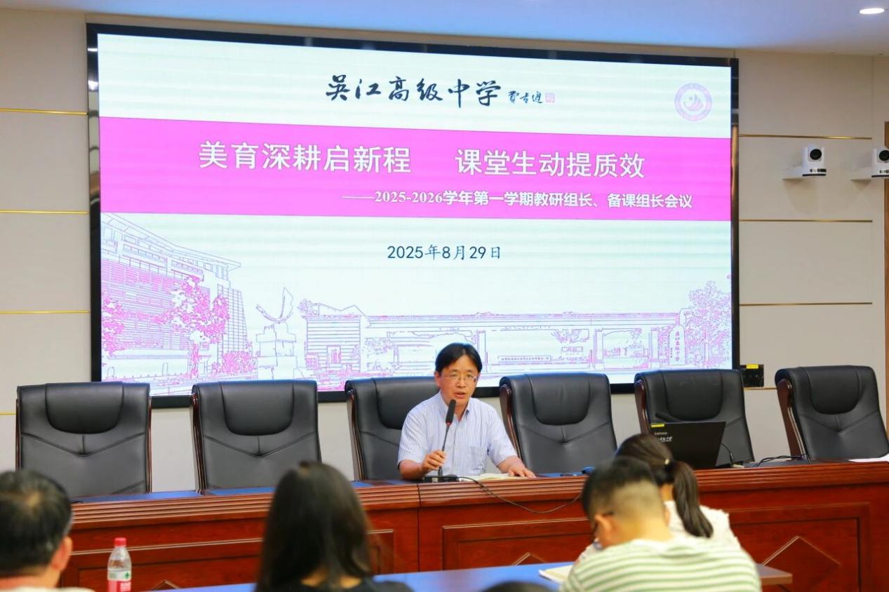 为进一步夯实教学质量根基,明确新学期教研工作方向,确保新学期各项工作顺利开展,吴江高级中学于2025年8月29日在有恒楼二楼会议室召开期初教研组长、备课组长工作会议。校长王建荣、教务处全体成员及全体教研组长、备课组长参会,会议由教务处主任吴蕾主持。本次会议以“美育深耕启新程,课堂生动提质效”为主题,旨在为新学期教研工作“定方向、明任务、鼓干劲”。