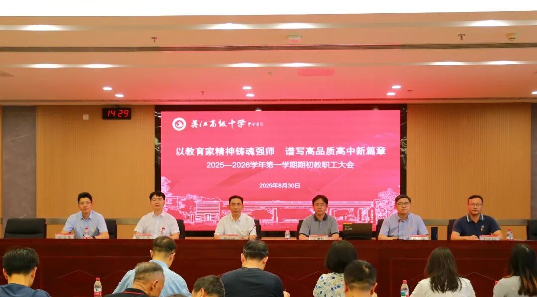秋风送序,新程将启.为更高效地统筹新学期工作布局、细化任务部署、确保每一项工作都能优质推进,2025年8月30日下午14:30吴江高级中学于征鸿楼二楼报告厅召开2025—2026学年第一学期期初教职工大会,会议由副校长徐峰主持。