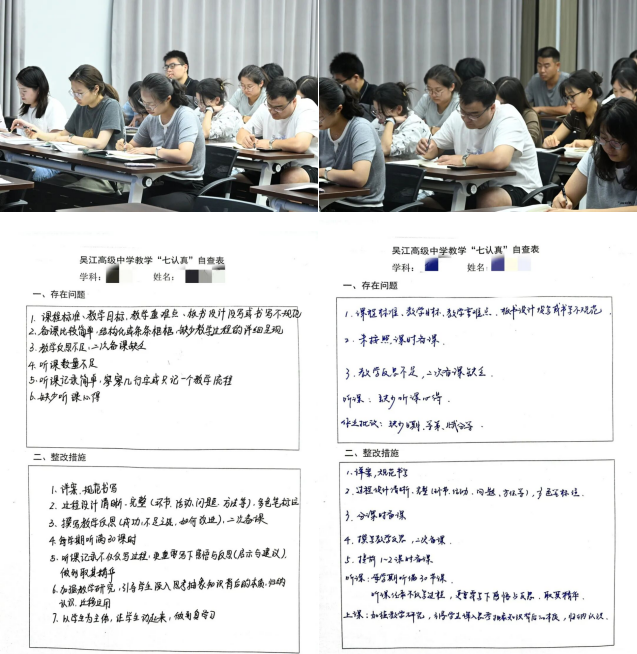 青年教师严格对照“七认真”要求自查不足,明确改进措施,并以此为契机,强化“苦修内功、规范教学”的主动意识,为提升教学能力与工作实效夯实基础。青年教师认真填写自查表图。