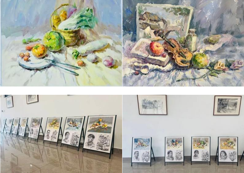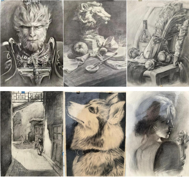 素描社的展区,静物的棱角分明、人物的神态鲜活、风景的层次错落,皆通过线条的疏密铺陈、明暗的渐变过渡精准呈现。褪去斑斓色彩的修饰,仅凭纯粹的黑白灰,便勾勒出事物最本真的模样,尽显写实艺术的严谨与细腻。