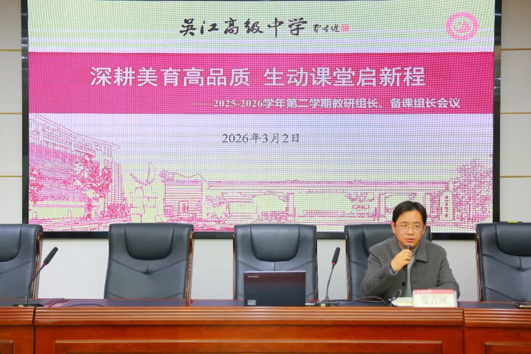为进一步夯实教研根基、深化“生动课堂”2.0版本建设、推进美育浸润行动,统筹部署新学期教学与教研重点工作,2026年3月2日,吴江高级中学召开期初教研组长、备课组长会议。校长王建荣、教务处全体行政、各学科教研组长备课组长齐聚一堂,为新学期教育教学高质量发展共谋新策,会议由教务处副主任钱溢芳主持。